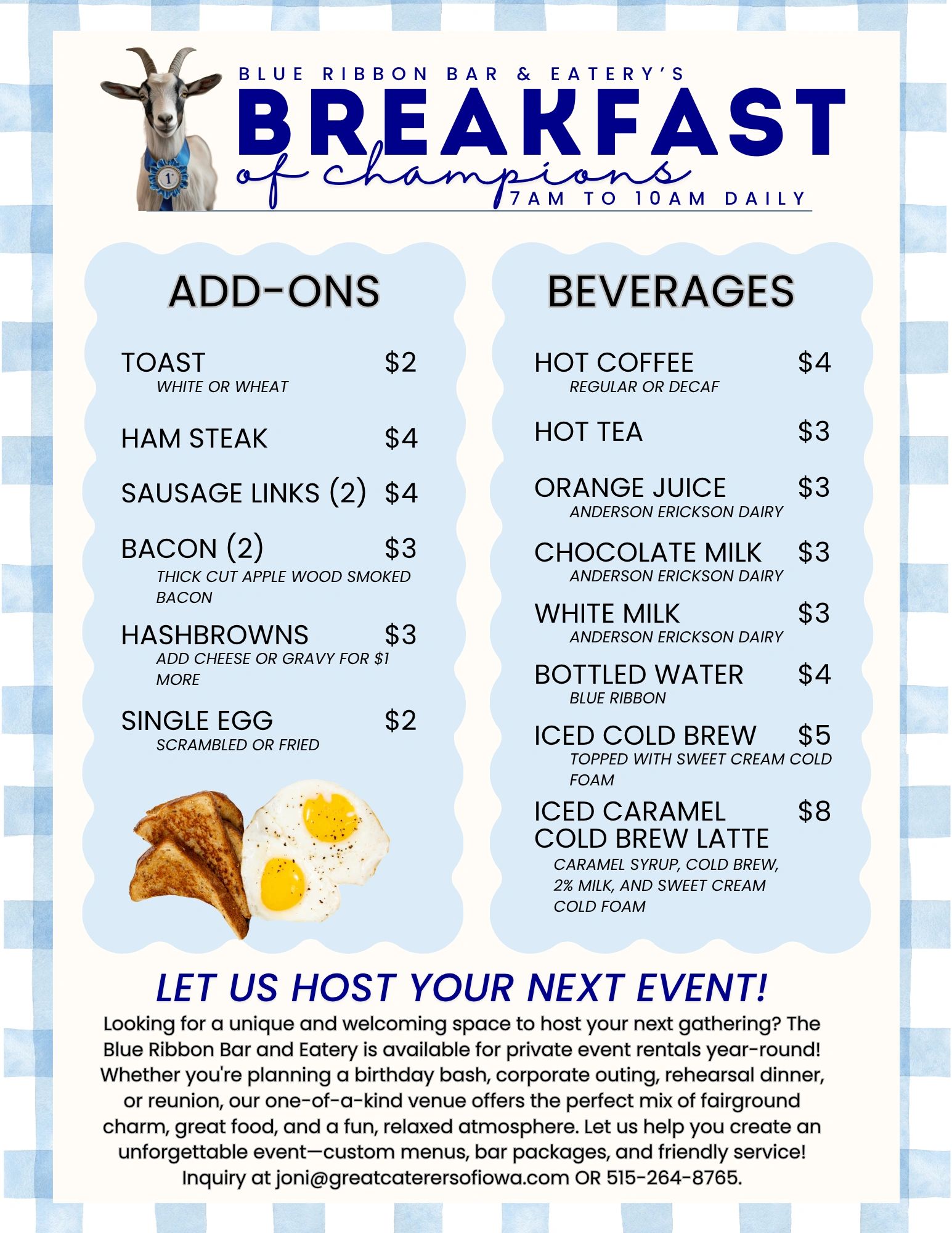 Looking for a unique and welcoming space to host your next gathering? The Blue Ribbon Bar and Eatery at the Iowa State Fairgrounds is available for private event rentals! Whether you're planning a birthday bash, corporate outing, rehearsal dinner, or reunion, our one-of-a-kind venue offers the perfect mix of fairground charm, great food, and a fun, relaxed atmosphere.